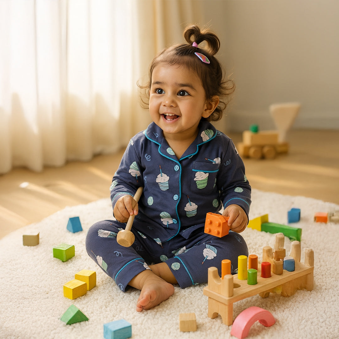 A cosy, soft night suit in deep grey with cute cupcake prints. Features a button-down top, contrast piping, and comfy elasticated bottoms. Perfect for snug, stylish sleep.